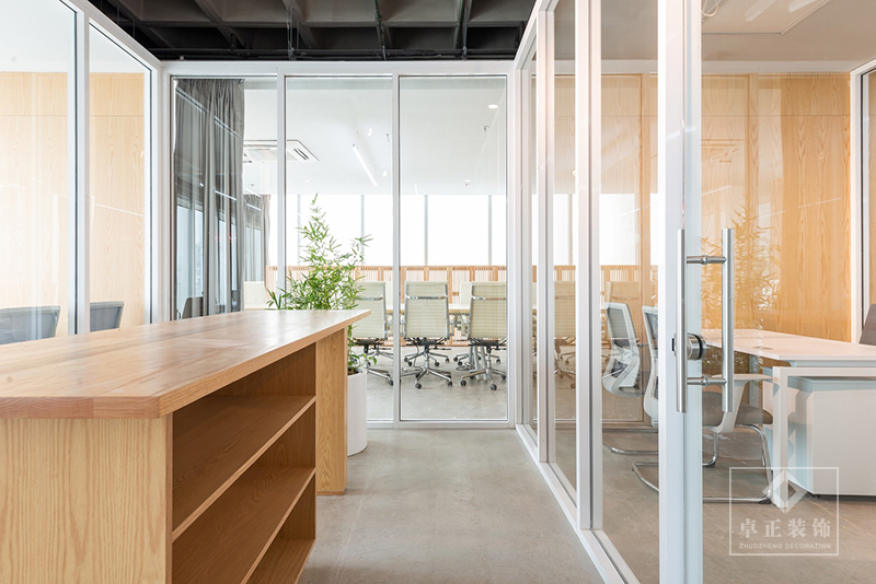 辦公室裝修項目最主要的目標是根據客戶未來的計劃設計一個高度靈活的空間,以滿足他們擴大空間的需求?;趯具\營方式的理解來展開空間的設計與項目是至關重要的。長沙公裝公司 設計師決定塑造一些包圍現存柱子的玻璃盒子來界定私人空間,并在開放平面的剩余空間中生成軸線,于是作為一個連續(xù)的空間可以和項目很好地結合。由此讓所有空間中的工作團隊都彼此距離較近,但依舊可以滿足一定的靈活性,可以在工作人員增多或減少時也不影響人員所在位置和所占空間。在一個較為基礎的配色方案下,植物和橡木突出了給空間帶來的溫暖感受,創(chuàng)造出一個最佳的工作場所。