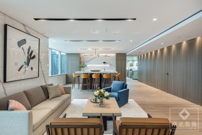 本次辦公室裝修案例的設(shè)計概念是將整個足跡分成兩個相等的部分。第一部分是在最輕松的家庭式氛圍中問候客人和娛樂。以人為本的設(shè)計以休息室為重點,同時被會議室,交易室,呼叫室和茶水間等功能空間圍繞,將辦公體驗提升到了新的舒適度。會議室的滑動面板可與休閑區(qū)結(jié)合使用,以進行活動。設(shè)計師有意省略了接待柜臺,在一個休閑的會議角上展示了數(shù)字蒙太奇和公司徽標(biāo)的數(shù)字墻,就像是一件藝術(shù)品。第二部分設(shè)有員工工作區(qū),董事長辦公室和管理辦公室。
